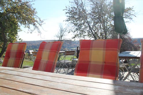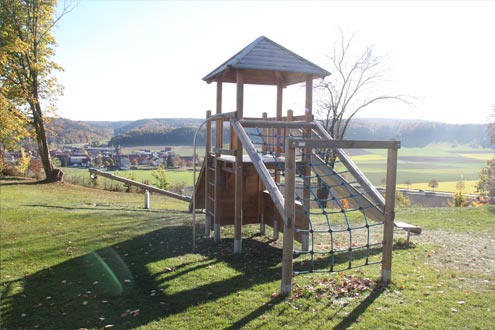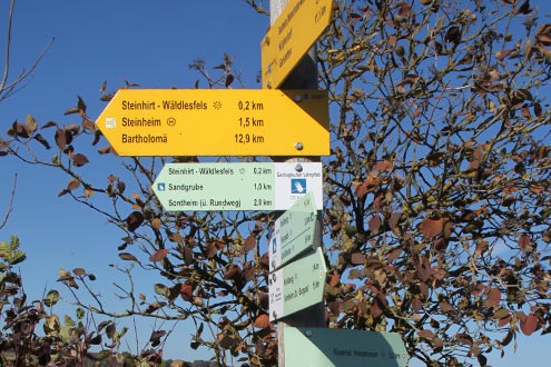 Der Rückweg führt uns über den Zentralkegel des Meteoritenkraters mit Einkehr in der Berghütte Kraterblick. Dort gibt es, neben einer tollen Aussicht in die Umgebung, auf dem eingezäunten Gelände auch einen Spielplatz für Kinder. Sofern die Hütte witterungsbedingt Ende Oktober noch geöffnet hat besteht eine Einkehrmöglichkeit mit Kaffe und Kuchen oder Versper.
